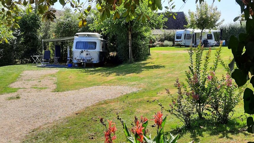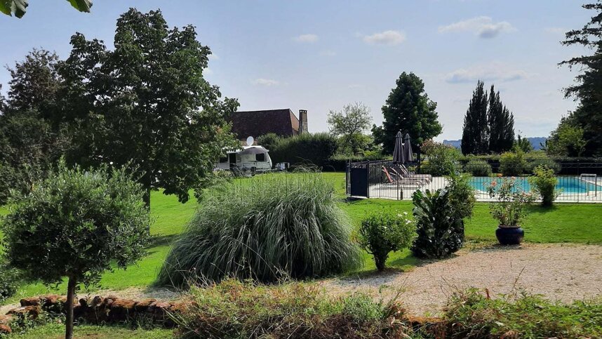 La Grenouille Vacances is a little paradise 'Adults Only' in the Dordogne situated on a plateau in the countryside with forests and meadows. A comfortable small campsite with eight spacious pitches is well maintained, private, sunny, and shaded. With an outdoor swimming pool with a terrace, you have a beautiful view of Hautefort. The sanitary block is new, modern and very clean. There are two showers, 2 WCs, three sinks, two hand basins, a washing machine and a tumble dryer. There are a fridge, freezer and microwave free to use, even as Wifi. There are also central BBQs with pick-nick tables available, as well as a herb garden. Several times a week, the campsite owners cook for guests and serve the meals in their restaurant or on the terrace