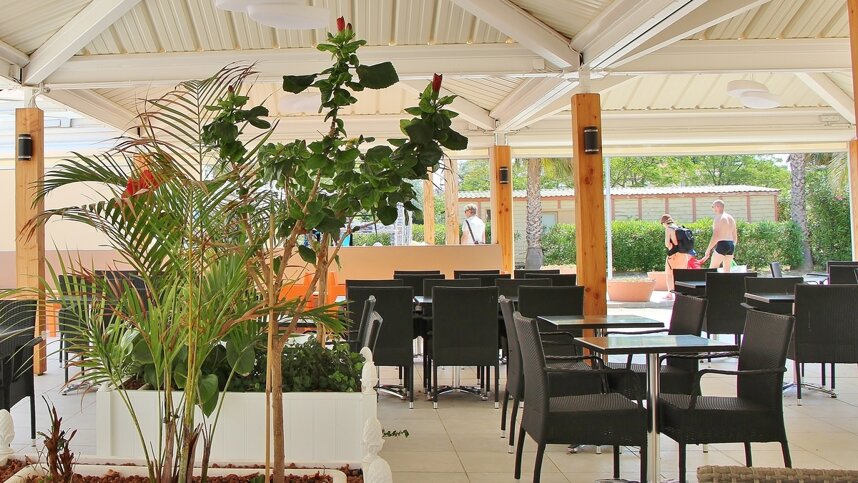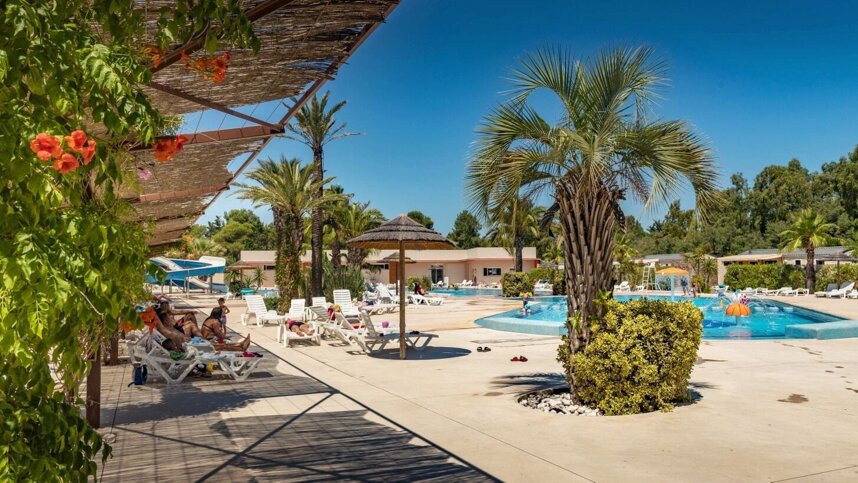 L’Oasis has quite a park-like feel with mixed deciduous trees and grass of sorts. The 496 pitches are well spaced with 249 for touring units and some 49 used by tour operators. The remainder feature mobile homes or chalets to rent. All have 10A electricity and are most are fairly level on sandy soil and grass, with varying degrees of shade. A sandy beach is within walking distance (about 1 km) but the site also has a pleasant pool complex. There is a smart bar/restaurant area with a stage for entertainment.