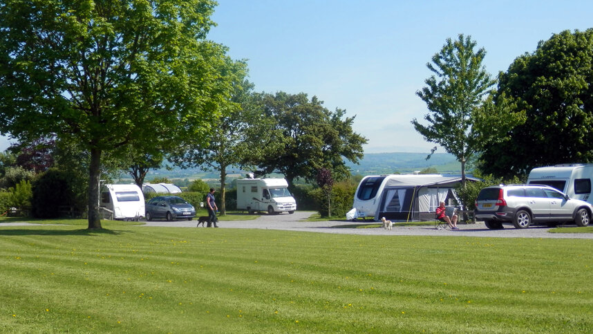The Old Oaks, an adults-only park, is tucked below the Glastonbury Tor in a lovely secluded setting with views across to the Mendip Hills. The grounds are immaculate, and much attention to cleanliness is given throughout. There are 100 large pitches in a series of paddocks, 91 with 16A electricity on hardstandings, and 50 are fully serviced. Mainly backing onto hedges, they are attractively arranged and interspersed with shrubs and flowers in a circular development or terraced with rural views.