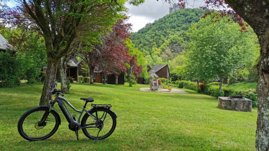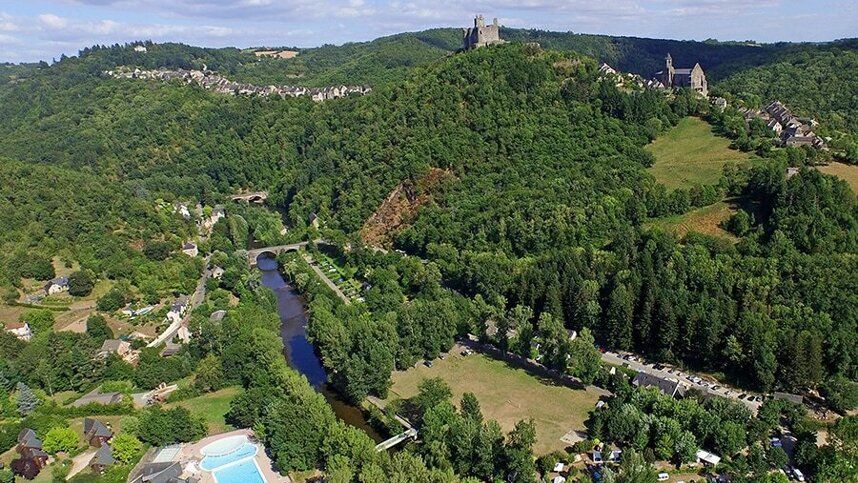 This site, owned by a large leisure company, is off the beaten track at the bottom of a deep valley beside the bubbling River Aveyron. It has 98 mostly level, grassy pitches, 42 used for stone built chalets and bungalows and 56 for touring (10A electricity). Most are separated by hedges and shaded by very tall trees and 23 are sited by river. Campers who stay a week more have access to the adjacent, large municipal swimming pool. In July and August there are some family activities with many more at the watersports centre next door.