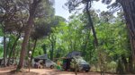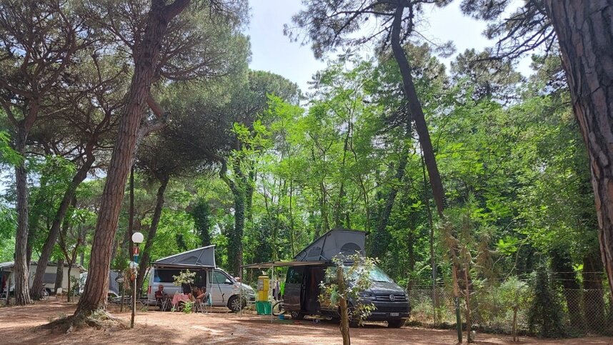 The pine forest which is home to Piomboni forms part of the Po Delta National Forest and has been spared the frantic commercial development of other parts of the Adriatic coast. The site, still family-owned and run, maintains a totally natural feel with pitches located between the ancient, tall pines and younger, dividing trees. There are 376 pitches for everything from tiny tents to motorhomes up to 8 metres, all with 4-10A electricity. Access to the beach is just 100 metres from the site gate and there are large, free public areas along with sunbeds for hire.