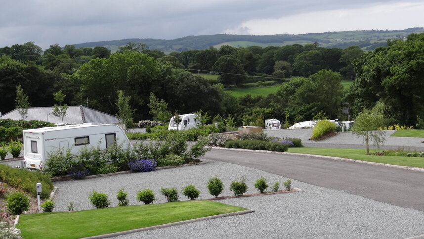 Heading towards North Wales, leave A55 at exit 24 on A547 through Abergele town centre. Continue straight over mini-roundabout at Tesco and next mini-roundabout. After 0.5 miles, turn left (Rhyd-y-Foel/Dolwen). After 3 miles at crossroads, turn left on B5381 for 0.5 miles and turn left signed Abergele and site which is 200 yds. on the left. Use directions rather than sat nav.