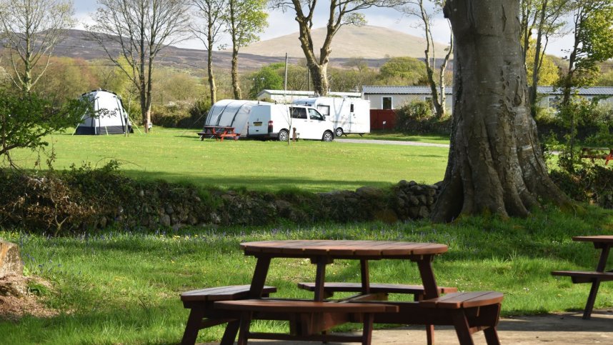 In a beautiful location, this traditional, family run touring site is within the grounds of a house that was built in 1785 in the Georgian style with a colonial style veranda. The 30 touring caravan pitches are set around the perimeter of a slightly sloping grass field, and there are eight hardstandings for motorhomes. There are 36 pitches with 16A electricity hook-ups, of which 17 also provide water and waste water. A separate tent field has ten pitches. Two ‘timber tents’ offer a touch of luxury camping. Please note there is minimal site lighting on the caravan field and none on the tent field, so a torch would be very useful. A further separate field houses five caravan holiday homes available to rent. A member of the Countryside Discovery group.