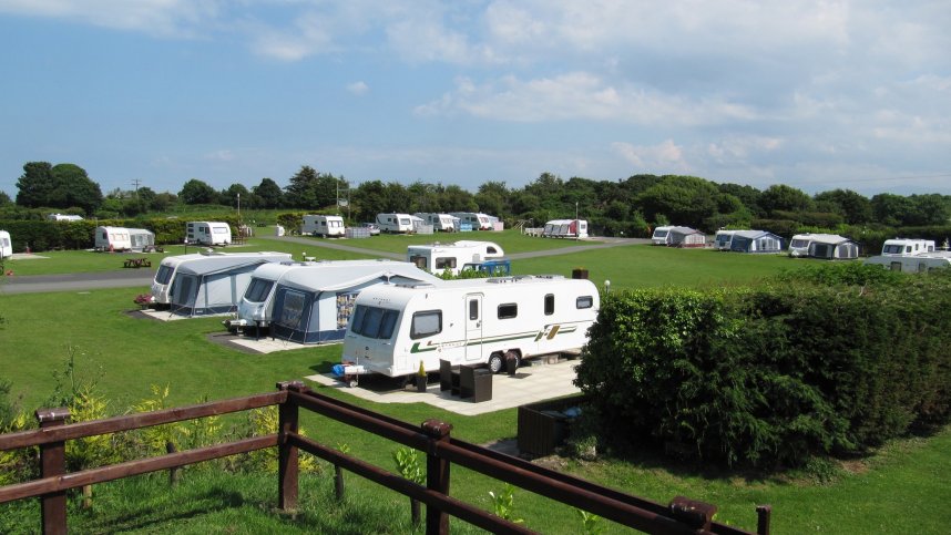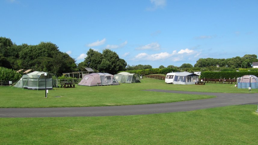 With 50 privately owned mobile homes in a separate field, this popular campsite is ideally located with a safe sandy beach a mile away and well positioned for exploring the island. Motorbikes, boats and jet skis cannot be accommodated.
