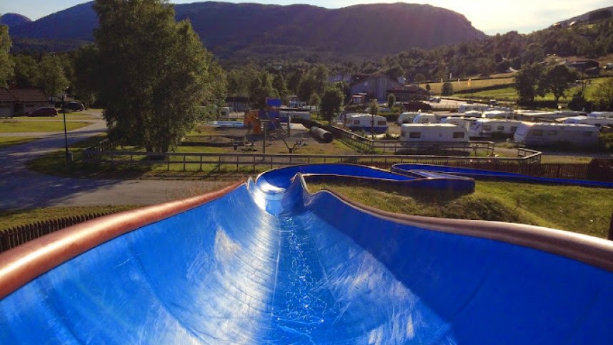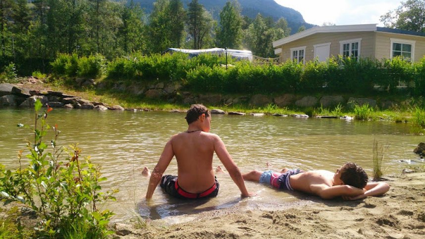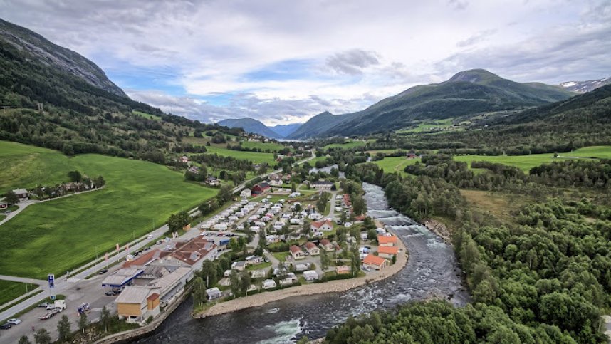 This family run site is situated on the E39 between Sognefjord and Nordfjord. It is 1.5 km. from the lakeside village of Vassenden, behind the family owned filling station, restaurant and supermarket complex, and by the fast-flowing Jolstra river (renowned for trout fishing). The 60 pitches (some marked) are on grass or gravel hardstanding, all with electricity (16A), and of the 15 touring pitches, ten have water, waste points and TV connections. A river tributary runs through the site forming a bathing pool and island on which some pitches are located. There are 18 cabins for hire.