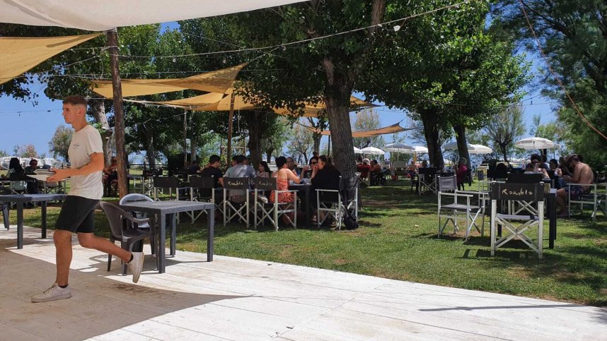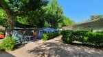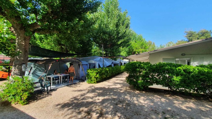 This is a pleasant small site of only 70 pitches, half for seasonal units and half for tourers. These are set randomly among the seasonal units and consequently there is a feeling of being part of a typical Italian holiday experience. Although it is near the busy SS213, it is far enough away for traffic noise not to be a problem, and the only noise we did hear was from the occasional small boat going down the river and this was hardly noticeable. The small pitches of about 60 sq.m. are all marked by tidy hedges and are shaded under pine trees. The site enjoys a semi-rural location alongside a private beach which campers may use.