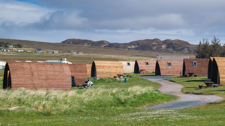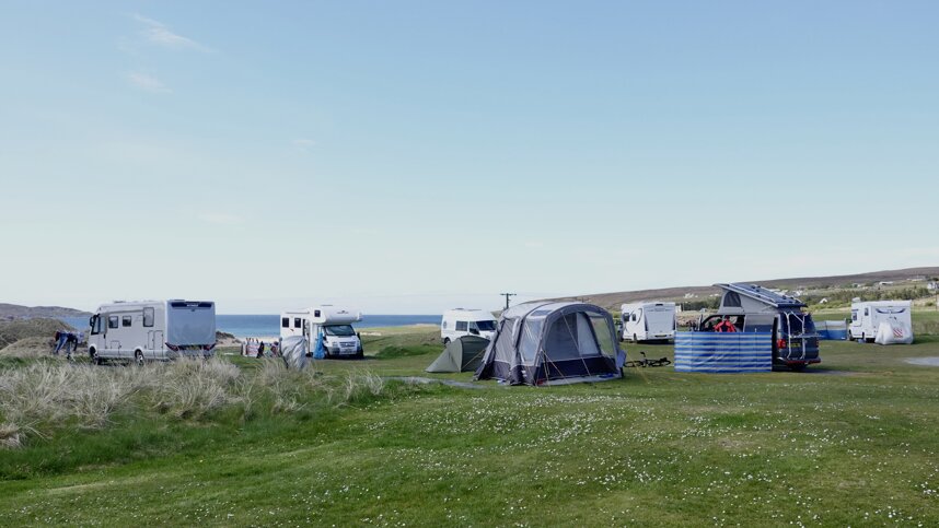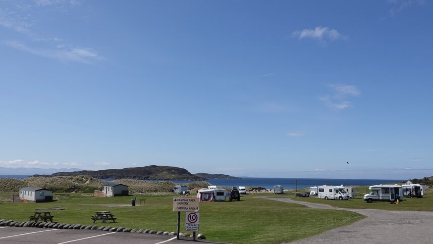 Sands Caravan and Camping is located just three miles west of Gairloch on the North West coast of Scotland. It is directly adjacent to a magnificent stretch of white sandy beach and most pitches have spectacular views of the Isle of Skye. Here you can combine the feeling of ‘wild’ camping with first class site facilities. The park offers 125 tent pitches on mown grass in hollows to the rear of the beach and 150pitches with electric hook-up for touring units. These are more formally arranged at a higher level. There are some hardstandings for motorhomes and the remaining pitches are on grass. Wigwams and static caravans are available for hire, all with extensive sea views. The site shop is very well stocked with groceries and camping equipment. The Barn restaurant on site offers freshly cooked food using ingredients from local suppliers. This is an ideal base for exploring the Wester Ross area with the Torridon Mountains, the impressive Inverewe Gardens and the historic fishing village of Ullapool or for simply relaxing and enjoying the views and facilities on site.
