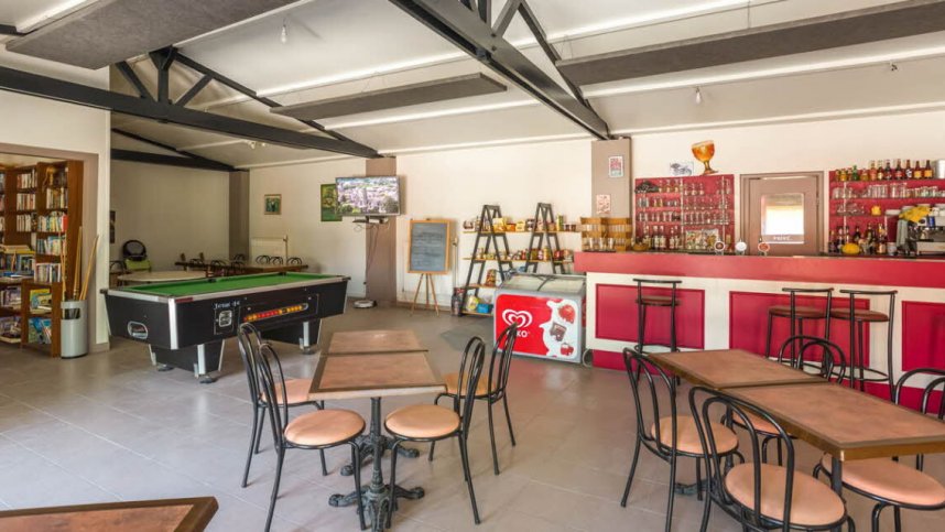 The reception and bar are at the site's entrance, just beyond the security gate. Other on-site facilities include a covered swimming pool, a children's playground with a trampoline, table tennis, a football pitch, and a basketball court. During the summer months, activities are organised for the whole family. There is also live music in July and August. Various catering trucks also stop at the site in the evenings during summer.