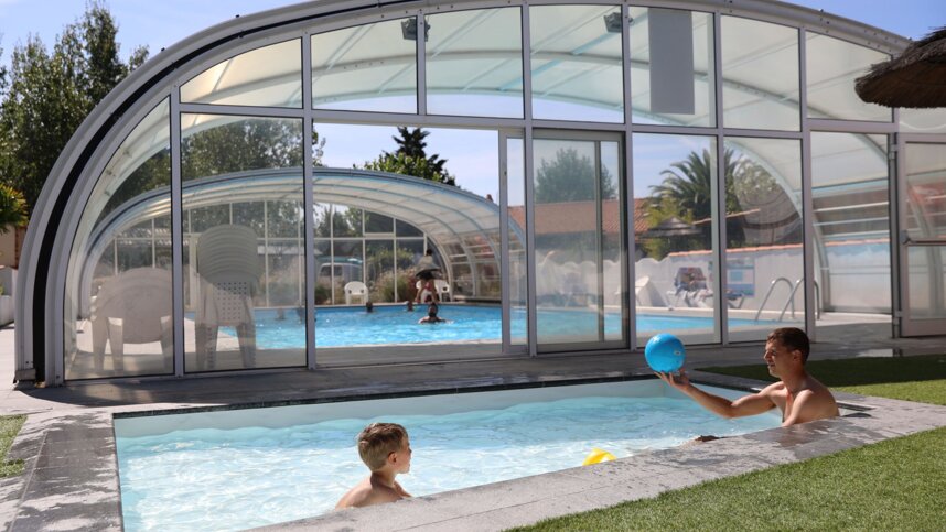 The toilet block has showers, washbasins and wc’s. Accessible facilities. Children’s toilet. Laundry with washing machine. Dish washing area. Chemical toilet point. Small shop 01/07-31/08. Snack bar 01/07-31/08. Pizzeria. Bread to order 01/07-31/08 Takeaway 01/07-31/08. Heated indoor pool 15/05-15/09. Heated toddler pool 15/05-15/09. Bar 01/07-31/08. Freezer for icepacks. Bike hire. Beach nearby. Golf nearby. TV room. Wi-FI. Children’s play area. Games room. Bouncy castle. Table tennis. Boules. Multi sports pitch. Shops nearby. Dogs allowed. Twin axle caravans allowed. Earliest time of arrival 15.00.