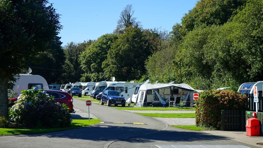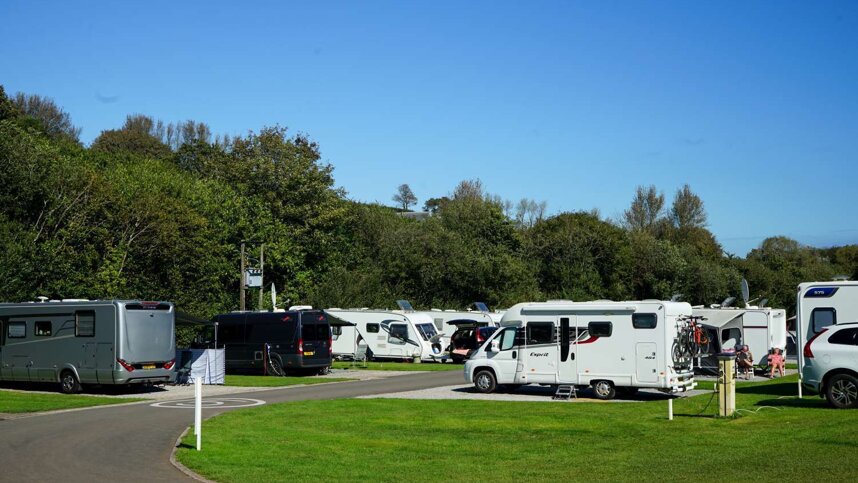 The central sanitary block provides WCs, wash basin in cubicles, showers and accessible facilities. Also provided are washing up sinks, a well furnished laundry and a fresh water point and and waste water drainage. Around the site are chemical emptying points, water and refuse disposal as well as a motorhome service point. Dog pit stop and dog walking is also available. No late-night arrivals area. Children’s play area. Wi-Fi, charged. BBQs allowed gas, electric & charcoal. Defibrillator. TV reception booster system. Information room. No tents allowed. Earliest time of arrival 1:00pm. Tesco 6 miles. The adjoining farm shop serves lunch and breakfast as well a good supply of fresh produce. Buses to Kingsbridge and Dartmouth a just a couple of minutes walk from the site.