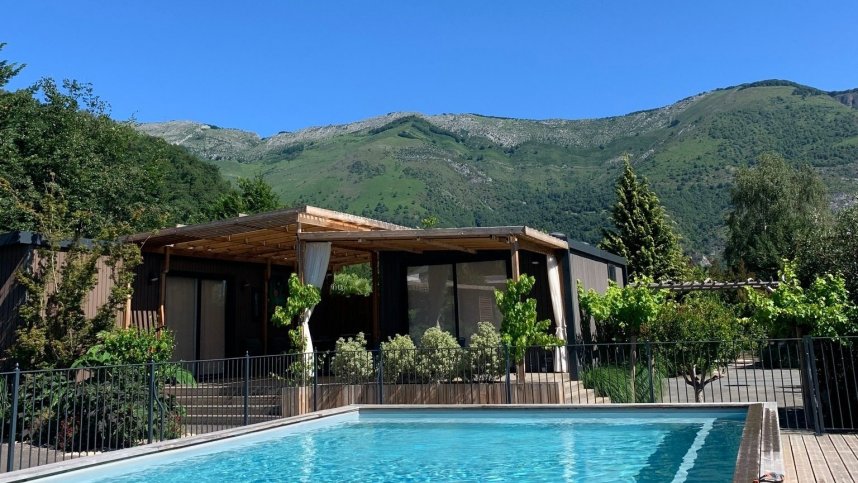 Attractive outdoor pools, jacuzzi, water chutes and heated indoor pool with opening roof are features of this large and lively site. It has 200 level grassy touring pitches, with some mountain views, and 283 mobile homes. All have electricity (3,6A). Reception staff are helpful and friendly. Visitors can gather in the new, imaginatively designed centre to eat, drink, chat, use the WiFi, watch events on the overhead TVs and in season enjoy the daily programme of professional entertainers. All visitors can enjoy an impressive programme of activities. The pilgrimage town of Lourdes is nearby.