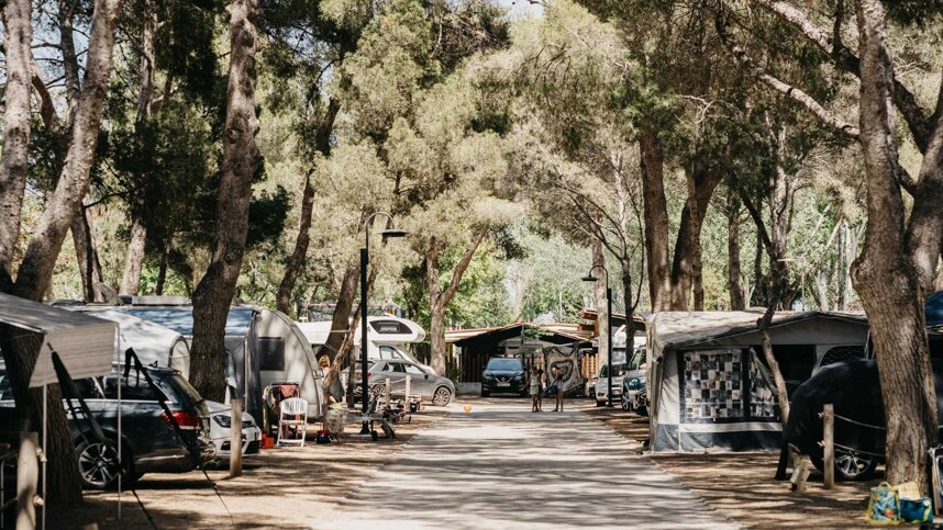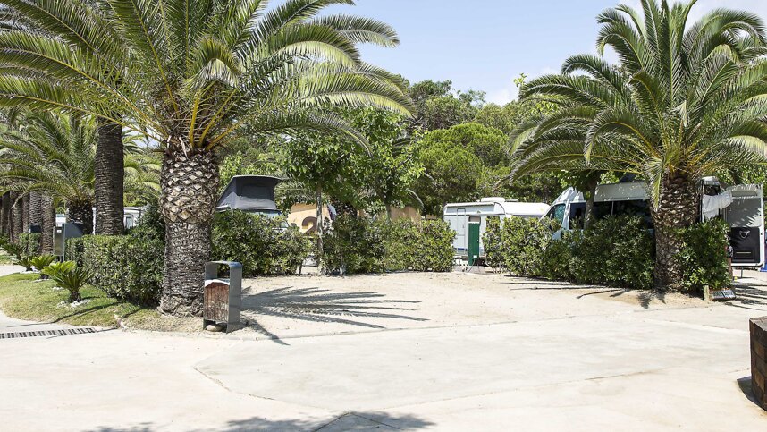 This is a marvellous, beach-side site, attractively situated at the foot of the imposing Tamarit Castle at one end of a superb one-kilometre-long beach of fine sand. It is landscaped with lush Mediterranean shrubs, studded with pines and palms, and home to mischievous red squirrels. There are 425 good-sized pitches for touring, all with electricity (16A), 340 of which are fully serviced with water, drainage, TV connection and 16A electricity. Fifty very popular pitches are virtually on the beach. On hard sand and grass, some are attractively separated by hedging and shaded by trees.