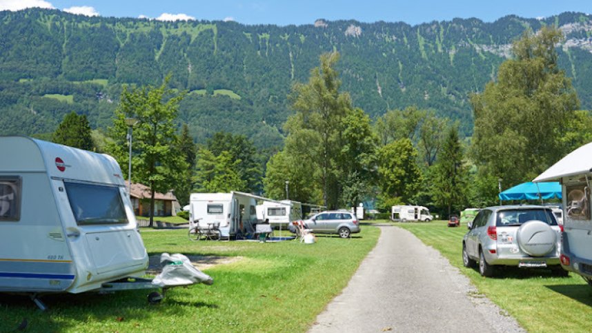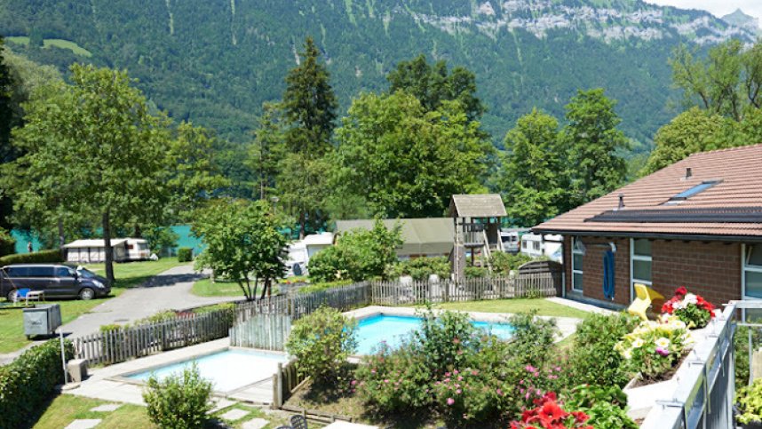 This small, quiet site, bordered on two sides by Lake Brienz, is only 1.5 kilometres from the centre of Interlaken and the autoroute exit. It is therefore a very convenient site, not only to spend time on and enjoy the lake and mountain views, but also as an ideal base to tour this picturesque region dominated by the Eiger and Jungfrau mountains. Almost all the 120 pitches are available for touring units. On firm, level grassy ground and under tall trees, all have 6A electricity. With magnificent views over the lake, gates give direct access to a footpath and to the lake shores. Interlaken is the tourist centre of the Bernese Oberland.