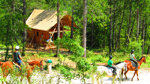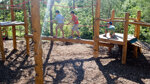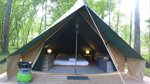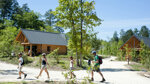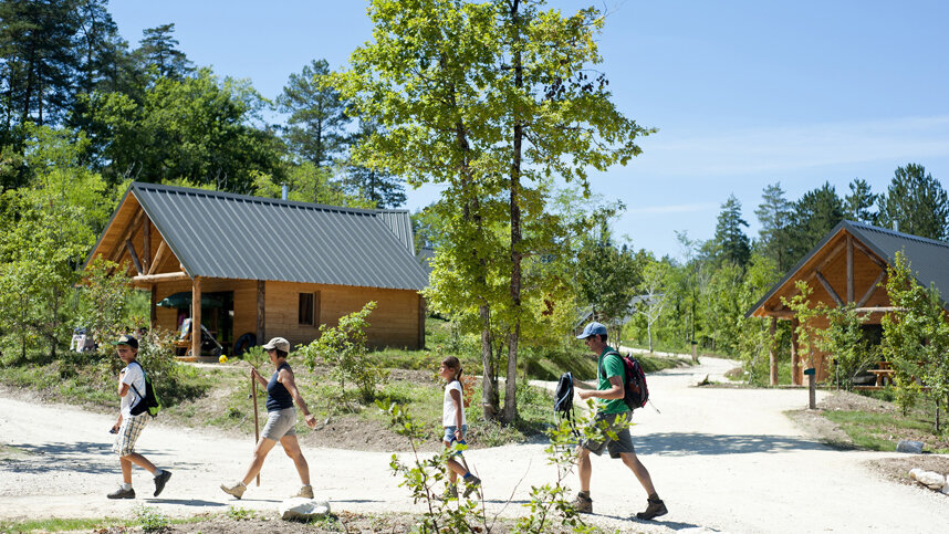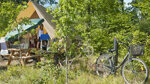 Lanmary, the first Huttopia forest camp, opened in 2013 has been carefully integrated into the landscape of the Lanmary National Forest. Some of the access routes in the campsite are quite rough and steep. Cars are only allowed on arrival and departure days. There are several designs of pre-erected tents and chalets, some on substantial stilts. Two chalets are adapted for those with reduced mobility (car access permitted). The touring tents can be pitched in defined areas and have plenty of space around each pitch, while other units must use the level pitches by the entrance. These are served by a large sanitary block, while three smaller blocks serve the tented areas.