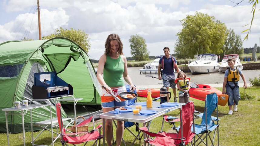 Set in the Norfolk Broads adjacent to the River Waveney, this site has something for everybody but will particularly suit those interested in boating. There are 14 mainly level, grass touring pitches all with 16A electric hook-up, plus 35 large tent pitches, many with electricity. The facilities are of the highest standard and include an indoor swimming pool complex with a café. There is a recently refurbished pub that serves local Adnams ales and locally sourced food. A games arcade for children (in the pub), a wildlife garden and an adventure play area will keep children busy. There is boat hire available and launching facilities for own boats. A foot ferry service is available across to the marshes, offering miles of rambling and wildlife watching in the wetlands.