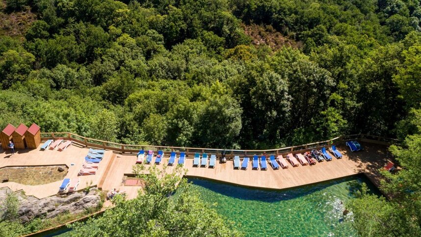 Le Bout du Monde is a really special place at the heart of the Montagne Noire, on the edge of the Haut Languedoc regional park. Here you can experience life as it used to be. Children help with the animals on the farm, roam the woods, swim in the natural pool and learn to make bread and pottery. Grown ups have a chance to unwind in natural surroundings. This small site is a member of the Yelloh! Village group and at present there are 108 grass pitches with water and 8A electricity, most hedged. The toilet blocks are in keeping with the ethos; one is in a converted pigeon house, the other, under a turf roof, has a bees’ nest behind glass – both however have modern fittings!