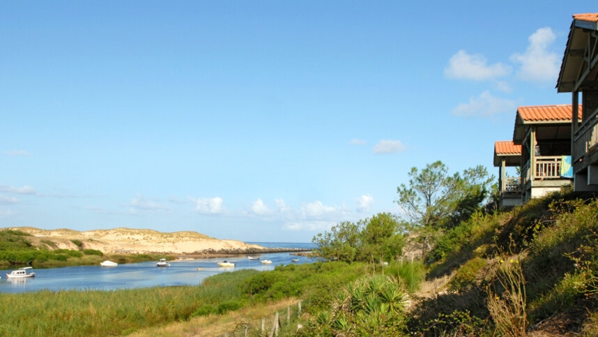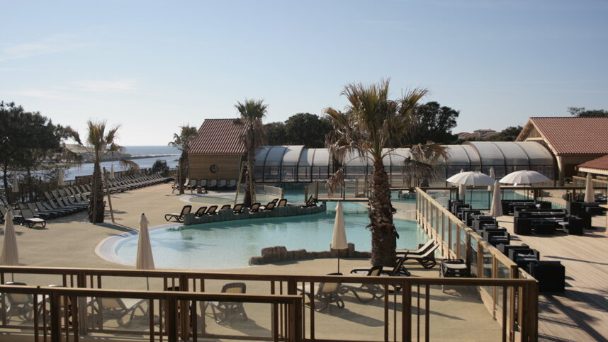 Lous Seurrots is only a short 500 m. walk from the beach with parts of the site having views across the estuary. There are around 500 pitches, mainly in pine woods on sandy undulating ground. They are numbered but many are only roughly marked out, some with good shade. All 148 touring pitches have 10A electricity (adaptors required). The site has a brand new Aquatic Centre with excellent access for wheelchairs. The complex has a superb setting among palm trees and flower beds, the decked sunbathing areas having wonderful views out to the estuary and the sea. For all its size, Lous Seurrots is a family site with the emphasis on peace and tranquillity with some well organised entertainment in peak season.